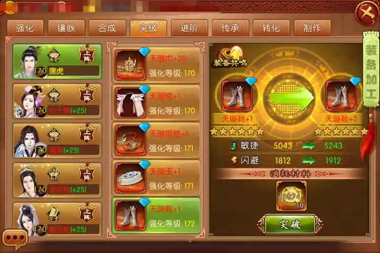 在装备选择上,巾和袍推荐九合的,项链选择九合或逍遥,玉和鞋子则推荐逍遥的(如有特别缘分的装备除外)。强化顺序建议先强化玉,以增加攻击力,其次为项链,若敏捷不足可先强化鞋子。宝石选择应以攻击、会心和增伤为主。在面对学士或御医时,可适当地将增伤换成敏捷。