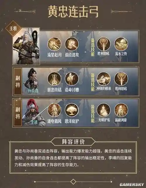 推荐组合:黄忠+左右开弓+白眉,搭配马良+进言+挫志怒袭。但需注意阵容平衡,需要一个前排抗伤害的角色。前排选择:诸葛亮是理想选择,但稀有度和资源分配问题使得其不太适合所有玩家。陆逊也是一个不错的选择,但技能需要调整,同样不适合平民玩家。