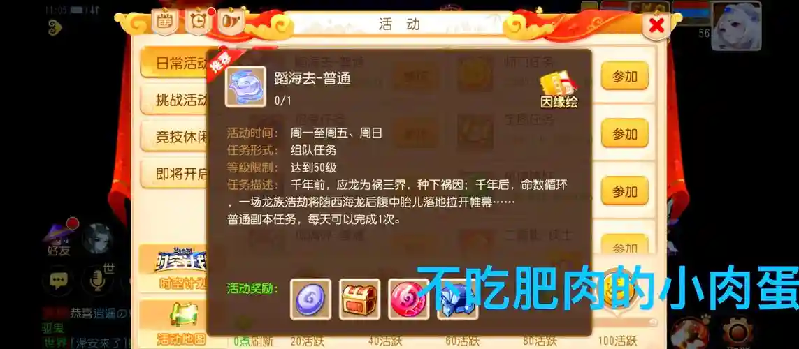 2、活动副本推荐等级:≥65级。玩家应保证自己满修且装备至少为半成品。推荐召唤兽:有鬼魂属性高敏吸血鬼。推荐阵法:鸟翔阵。怪物门派(从左到右):普陀山、龙宫、龙宫、狮驼岭、大唐官府。强烈推荐伙伴:镇元子。【战斗技巧解析】在战斗中,龙王是最棘手的目标。